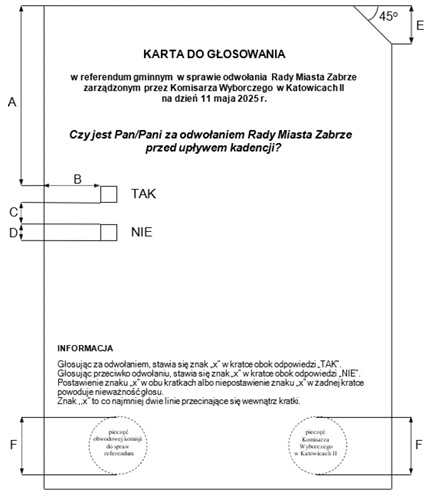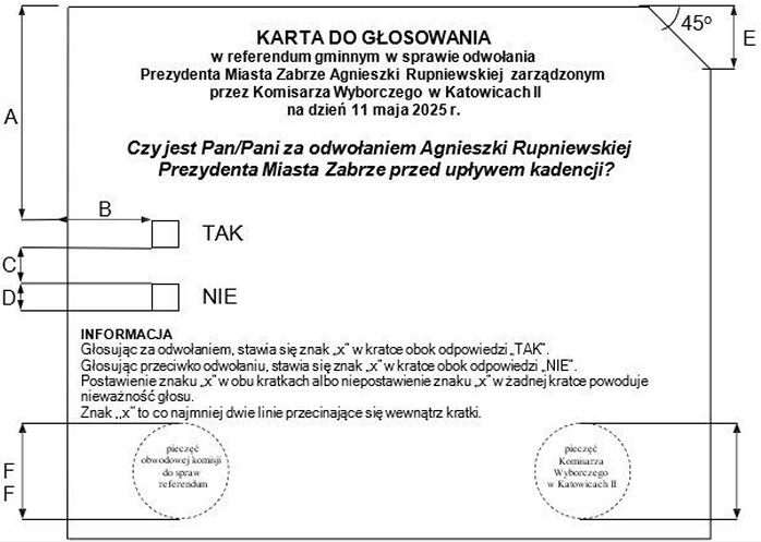 Wyborcy dostaną w lokalu wyborczym dwie karty do głosowania. Pierwsza dotyczyć będzie prezydent Zabrza z pytaniem: Czy jest Pan/Pani za odwołaniem Agnieszki Rupniewskiej Prezydent Miasta Zabrze przed upływem kadencji?” Wyborca stawia znak „Xtylko w jednym z dwóch kwadratów „TAKlub „NIE. Postawienie znaku „X” w obu kwadratach lub w żadnym spowoduje głos nieważny.