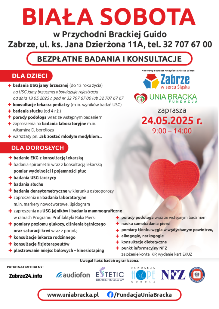 Liczba miejsc na badania w Przychodni Brackiej Guido w Zabrzu przy ul. ks. Jana Dzierżona 11A. jest ograniczona, dlatego warto przyjść już o godzinie 9:00! Organizatorzy nie prowadzą wcześniejszej rejestracji (z wyjątkiem badania USG jamy brzusznej dla dzieci).
